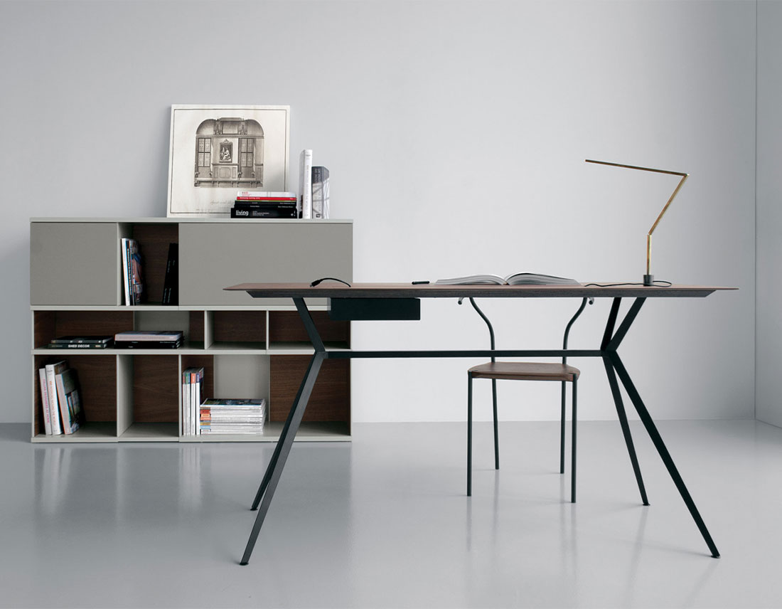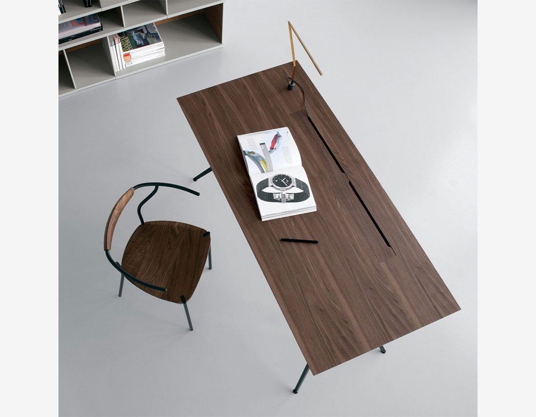 Les plateaux sont disponibles avec différentes géométries: rectangulaire, tête ronde, barillet, ovale et rond, qui donnent vie à une famille de 51 tailles de table, toutes réductibles à la taille et disponibles avec tiroir et presse-étoupes. Il existe des variantes de tables hautes et de bureaux.