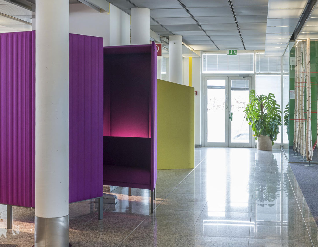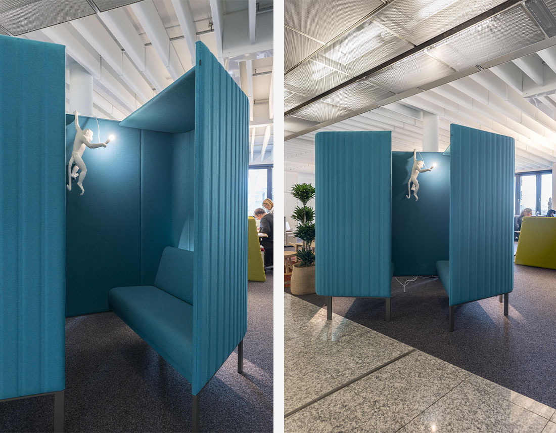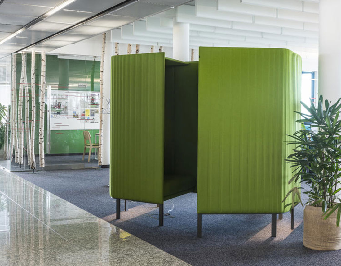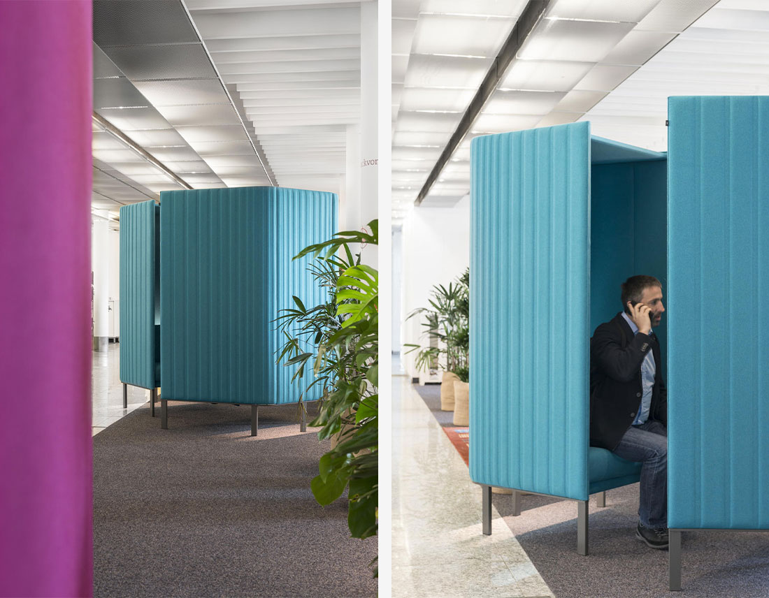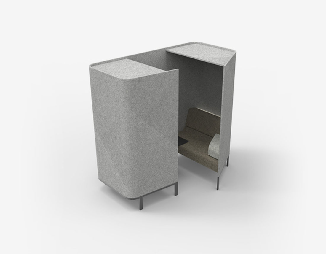 Inspiré des compartiments du train, ce cocon acoustique garantit l’intimité. Entourez-vous de quelques collègues dans ce centre de rencontre sans perdre le contact avec l’environnement.