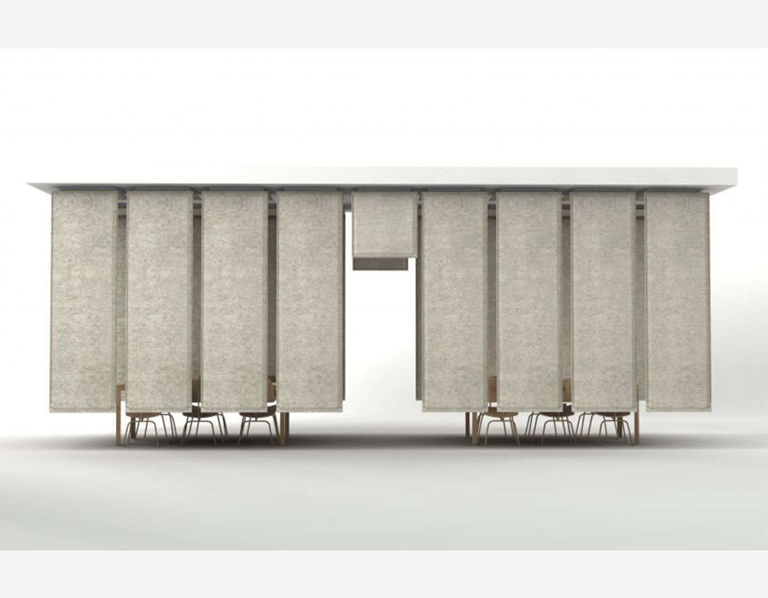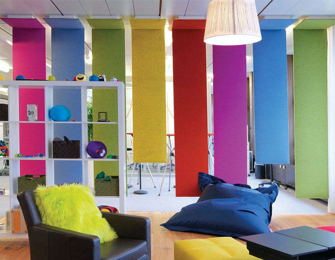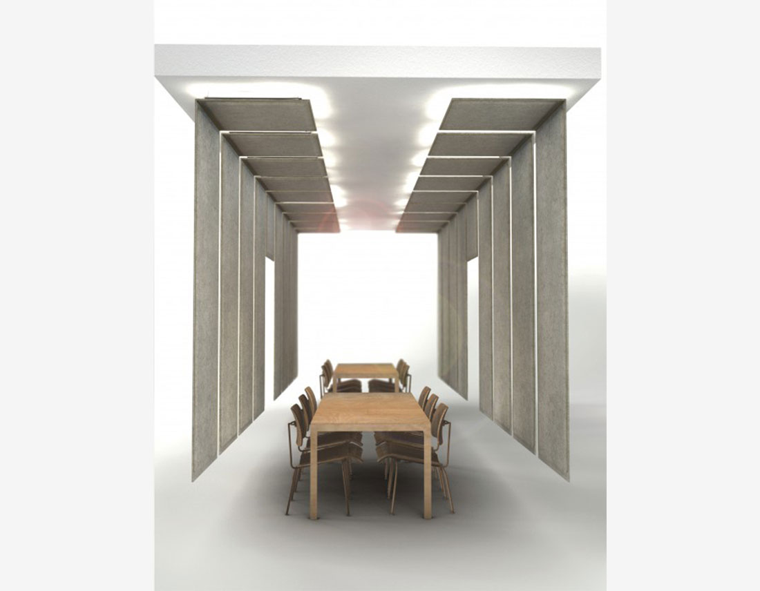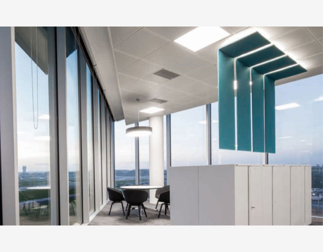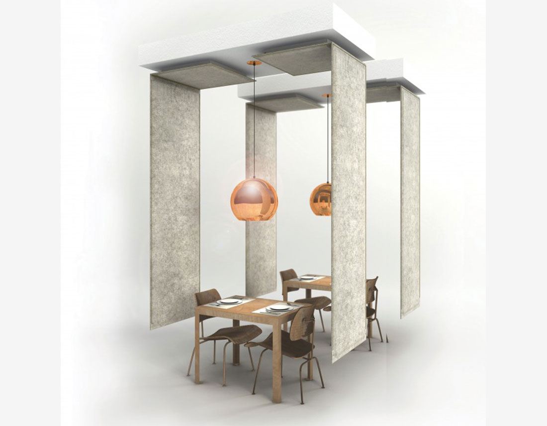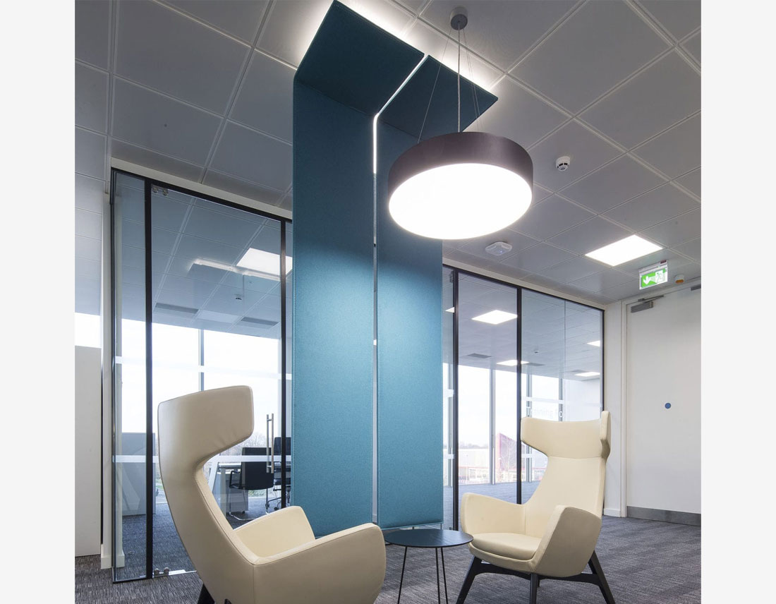 Et survolez une pièce bien équilibrée. Vous êtes maintenant autorisé à partitionner un grand espace acoustiquement et optiquement avec ces écrans de plafond BuzziFelt inventifs. En option, ajoutez de la lumière indirecte pour rendre l’atmosphère encore plus délicate!