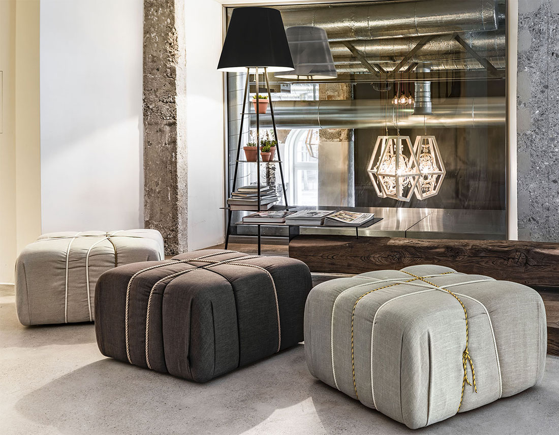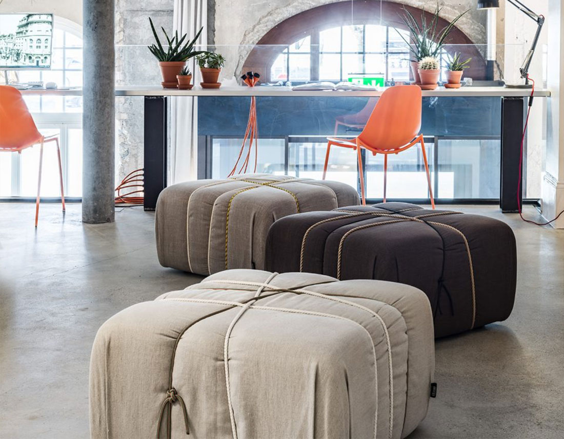 Che Pakko est un pouf qui s’inspire des colis à expédier, enfermés et liés par des cordes. Confortable, mais en même temps ludique s’adaptera mieux à votre environnement. Si vous souhaitez choisir pour votre entreprise, vous donnera un point de départ pour créer un thème de style! Disponible en quatre couleurs: blanc, écru, sable et taupe.