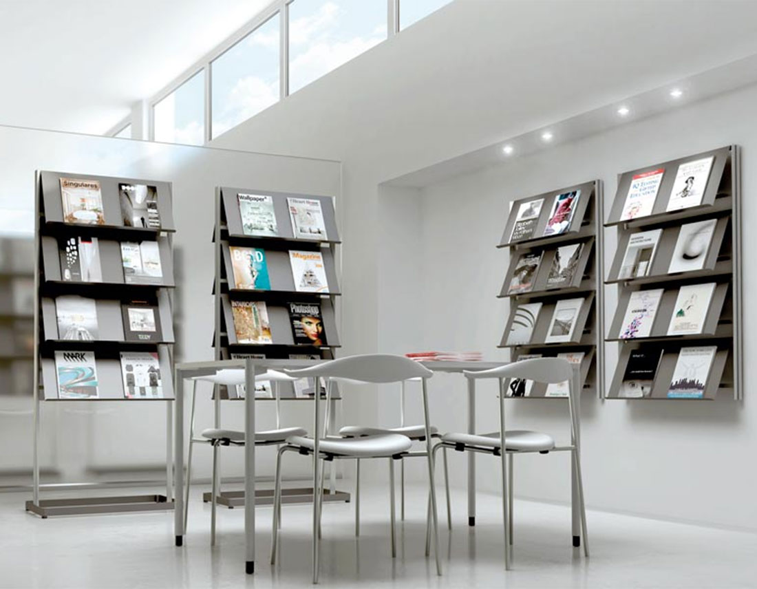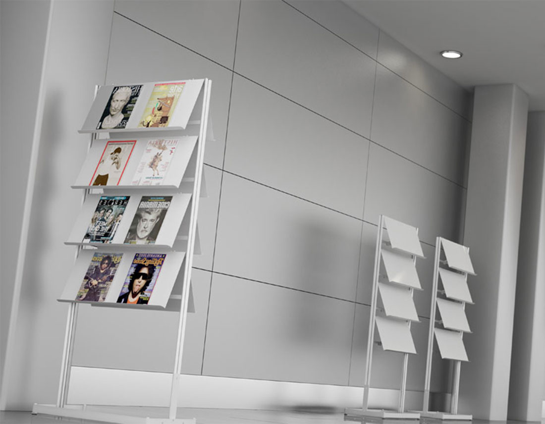 Présentoir vertical pour magazines, catalogues, etc… avec fication pied ou roulettes.