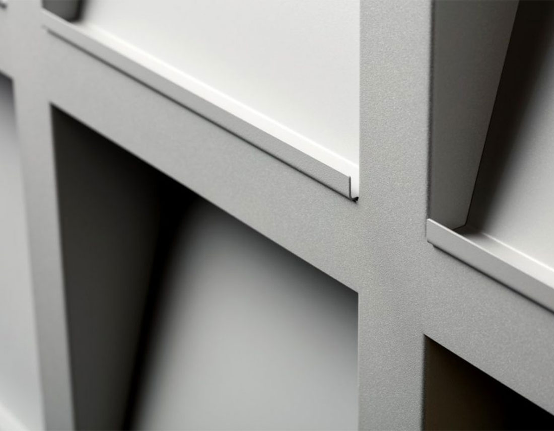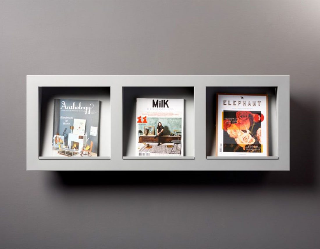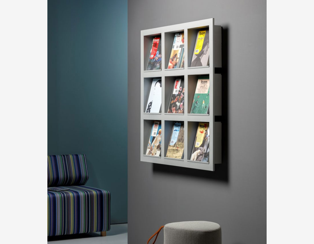 La gamme Frame propose des présentoirs muraux uniques pour chaque espace. Le cadre est disponible en trois modèles différents. Le porte-brochures est en aluminium à parois minces et a une laque gris argenté.