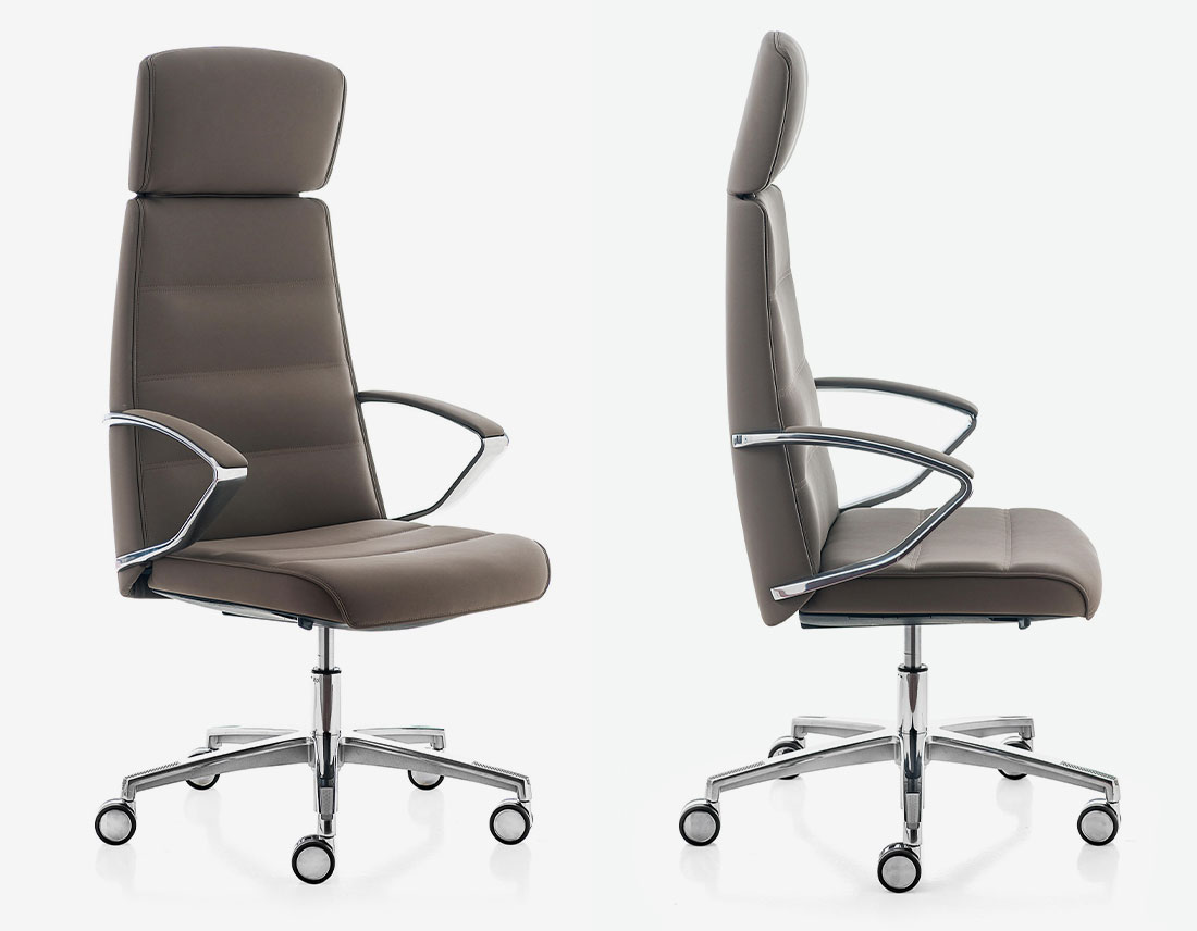 lisse sans coutures ou avec coutures linéaires. Le nouveau mécanisme synchronisé avec système automatique du réglage de la tension du basculage en fonction du poids de l’utilisateur n’est pas visible car il est intégré dans l’assise et il a des réglages simples et fonctionnelles. Les accoudoirs en aluminium poli avec manchette rembourrée sont fixés dans le dossier.