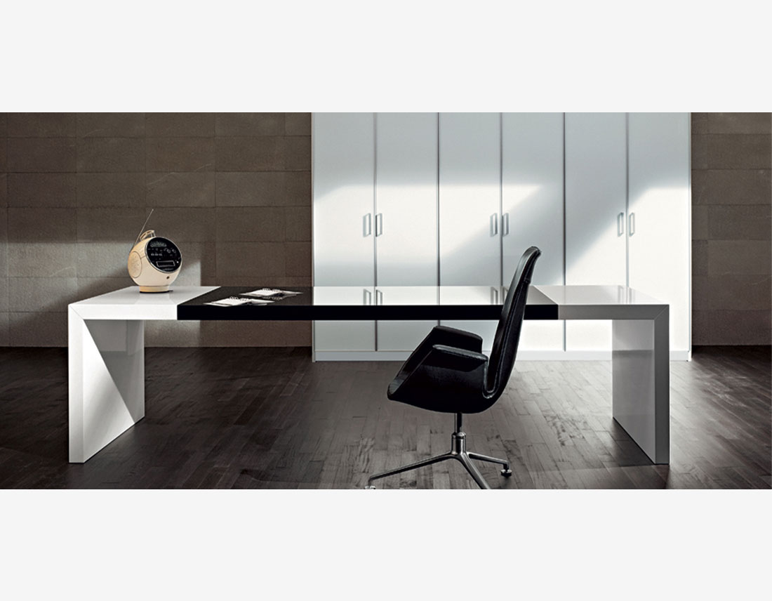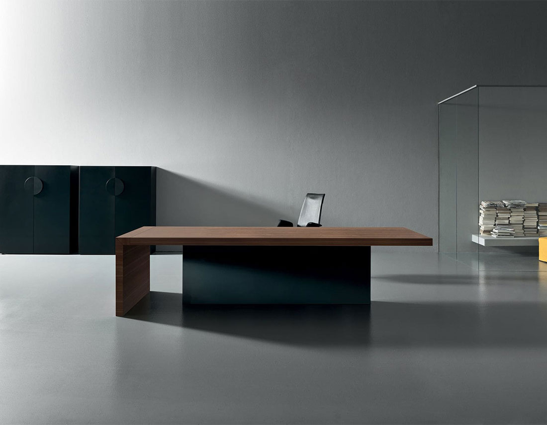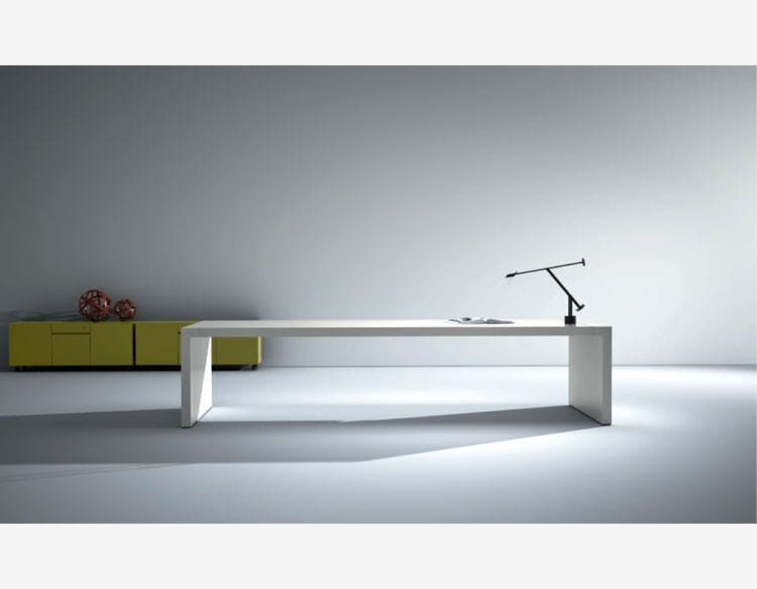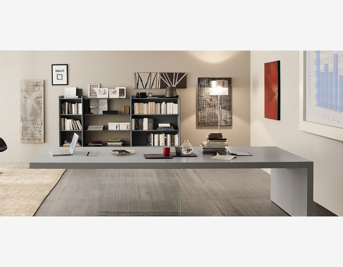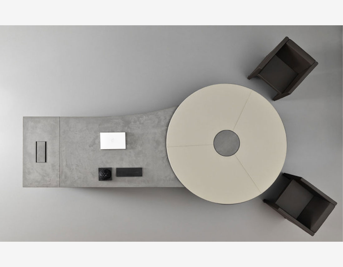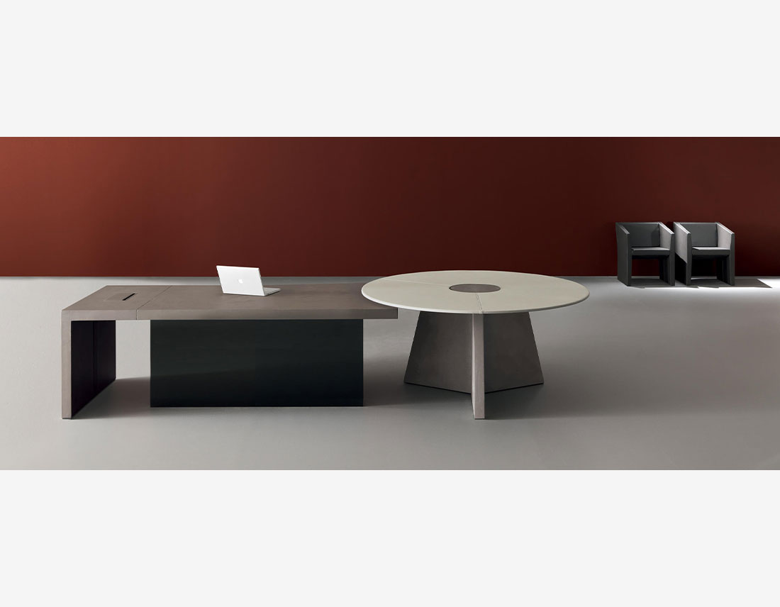Les bureaux et tables de réunion prévoient en effet une variété ample de matériaux: du bois au laqué, du verre au cuir, du ciment au solid surface ou au Fenix jusqu’aux matériaux plus spéciaux, sur demande, tels que le grès ou les marbres.