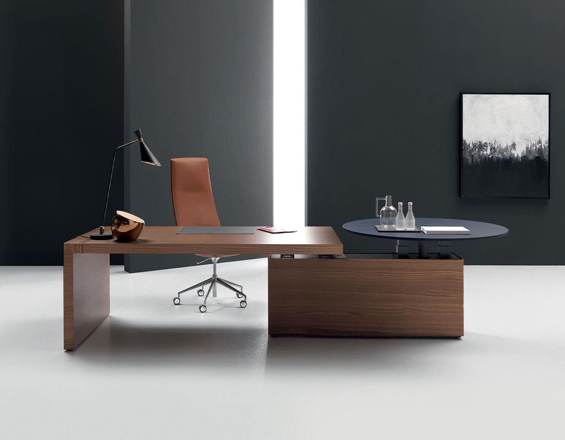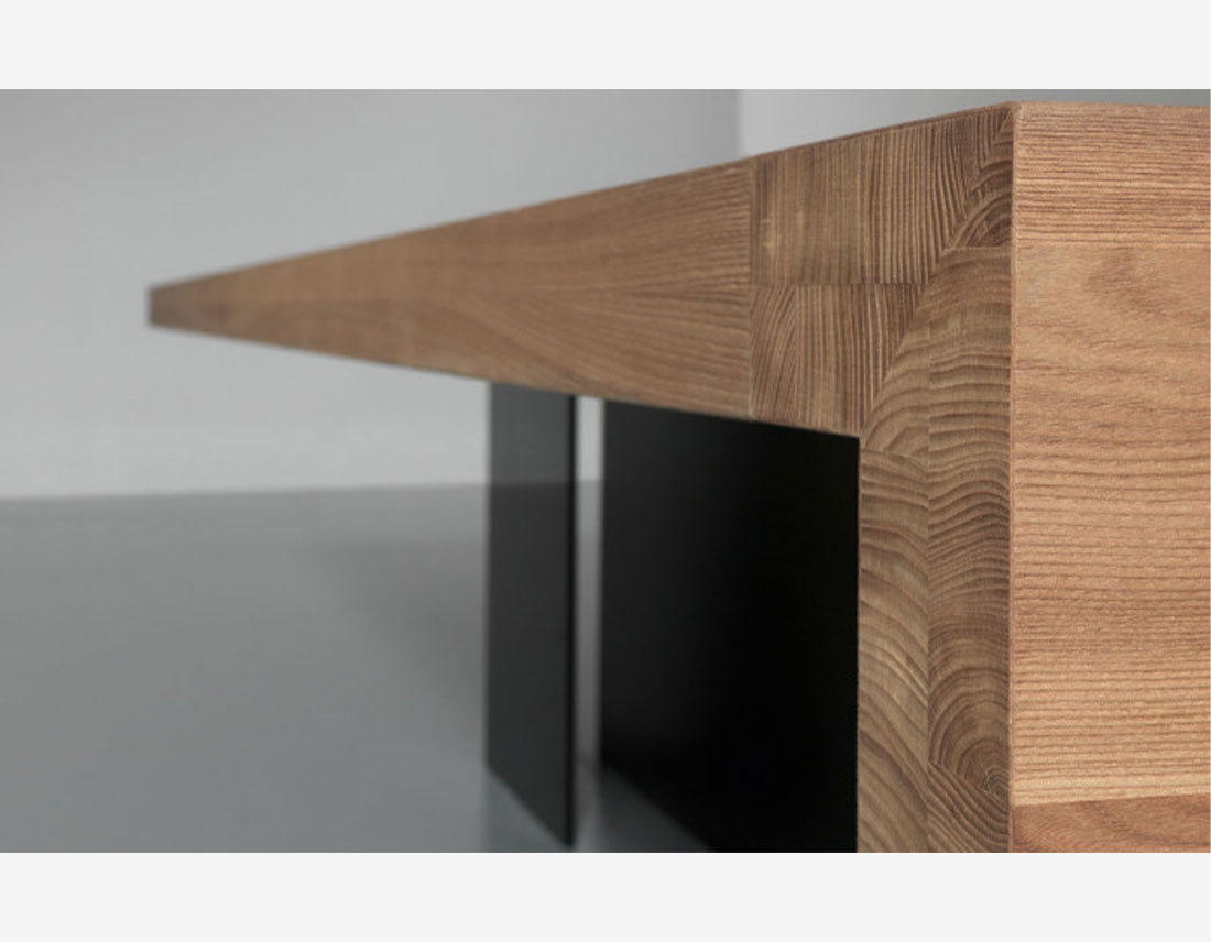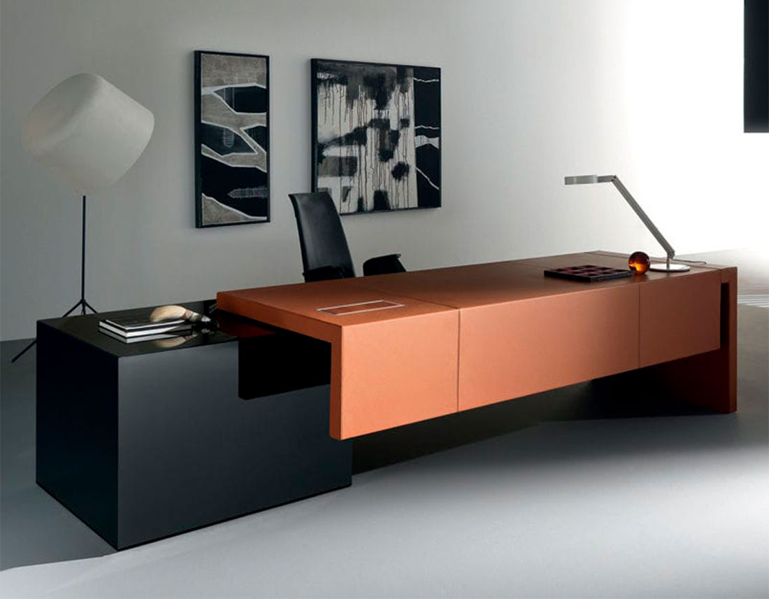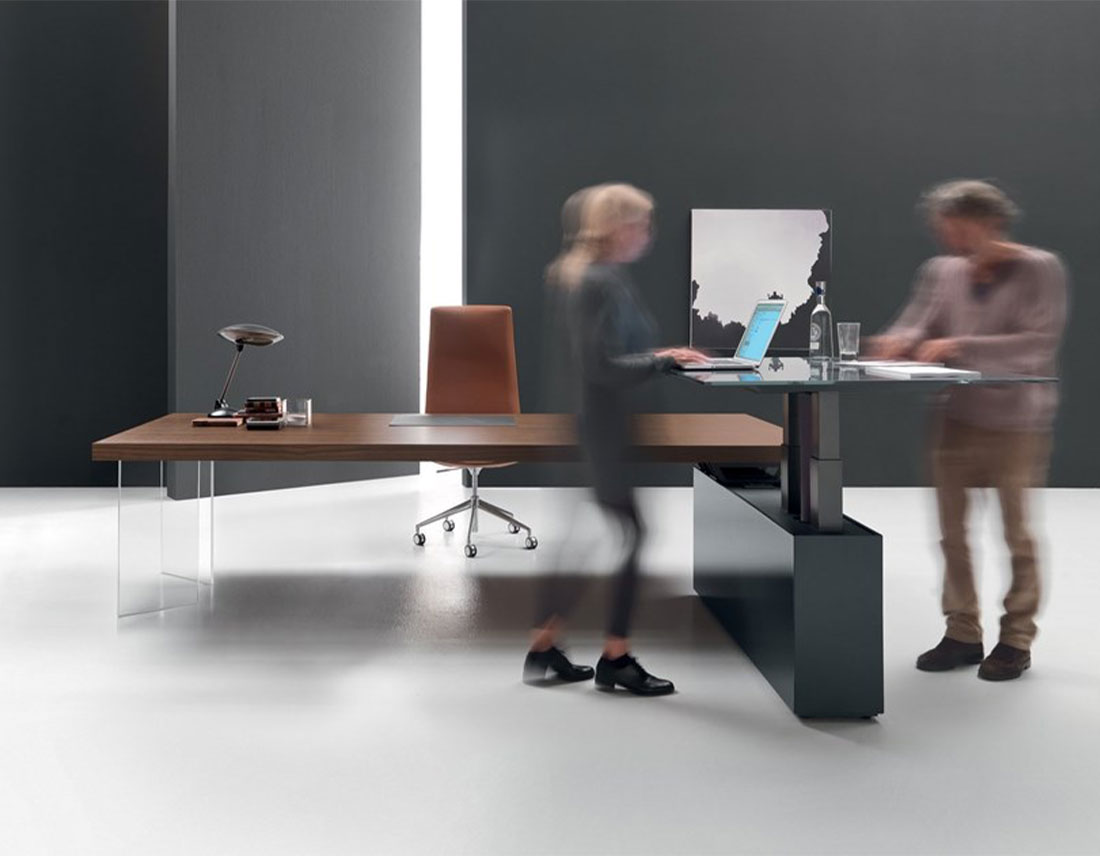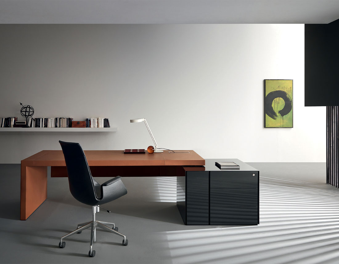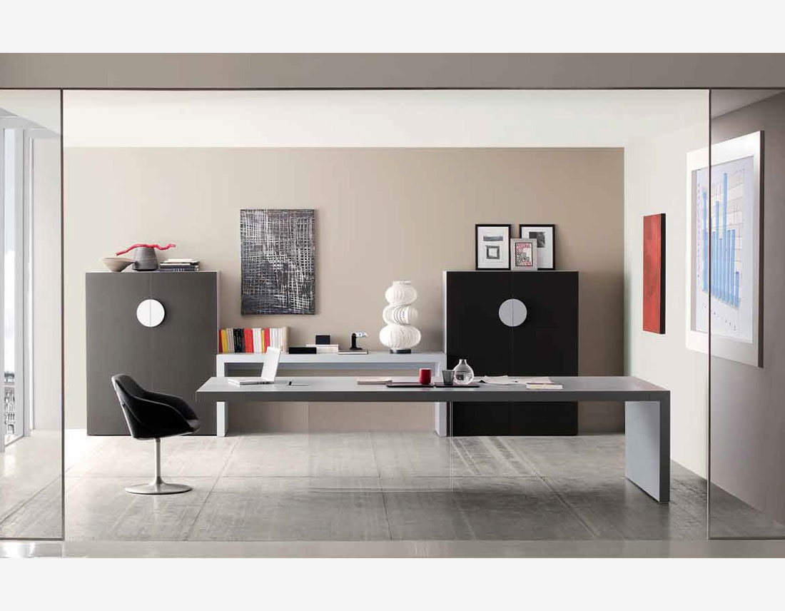 Les bureaux et tables de réunion prévoient en effet une variété ample de matériaux: du bois au laqué, du verre au cuir, du ciment au solid surface ou au Fenix jusqu’aux matériaux plus spéciaux, sur demande, tels que le grès ou les marbres.