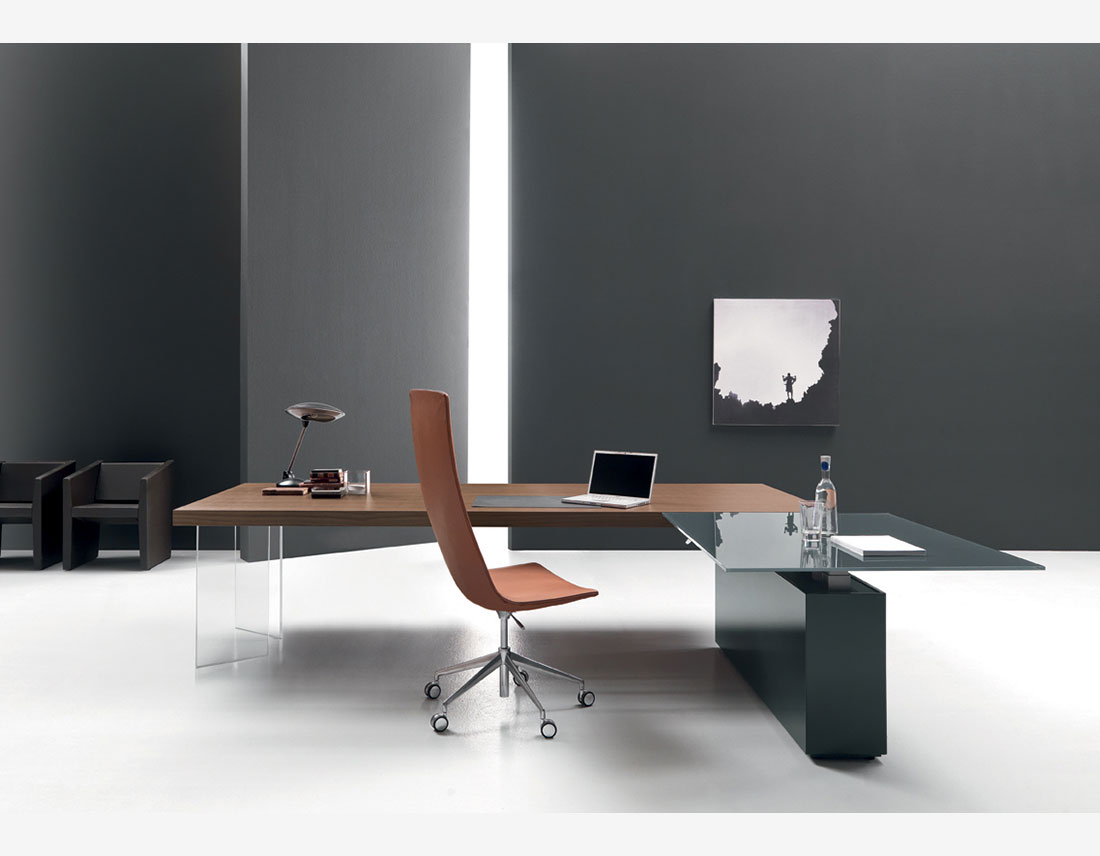 Les piètements du bureau sont par ailleurs multiples, il est possible de choisir entre pieds en bois de 70 mm d’épaisseur dans toutes les finitions du plateau, meubles structurels sous le bureau ou pieds en verre transparent extra clair pour un effet bureau totalement suspendu.