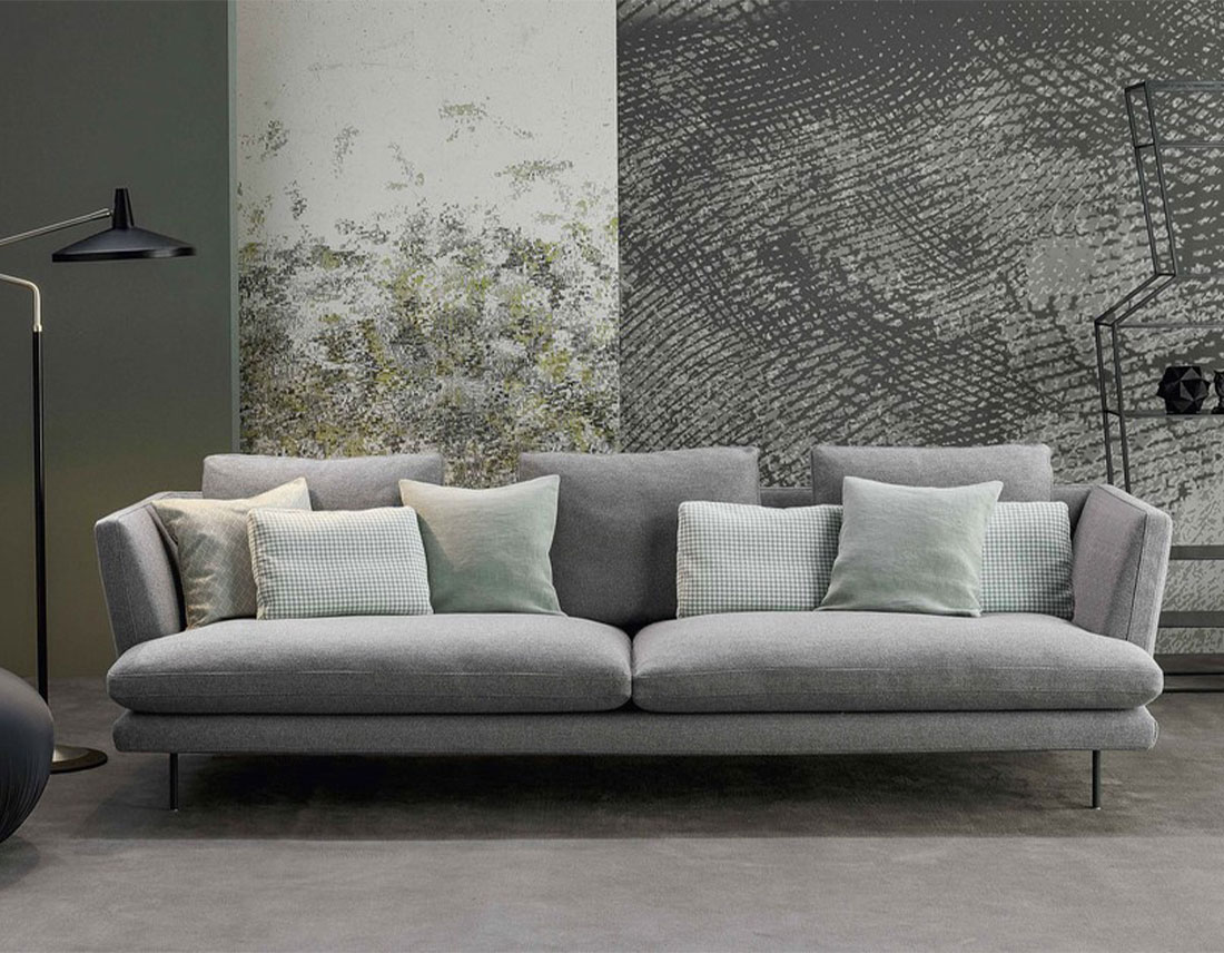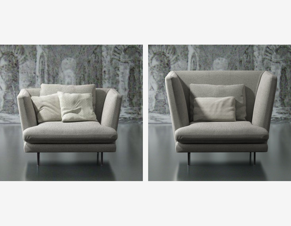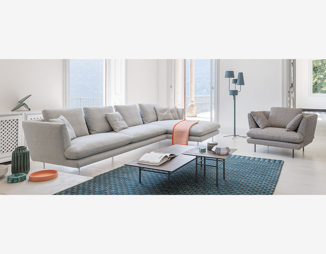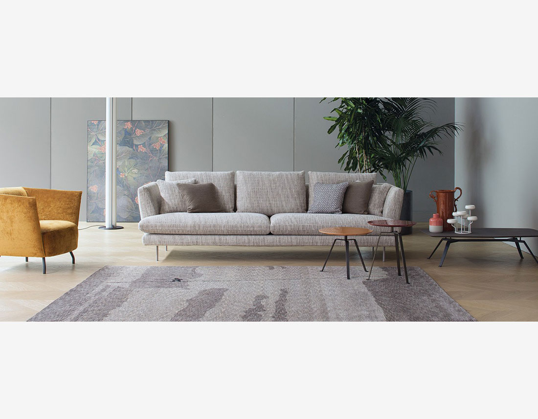 La légèreté est la particularité du canapé Lars: les accoudoirs sont légèrement inclinés vers l’extérieur; les pieds sont constitués d’une fine ligne métallique qui donne au canapé un aspect suspendu; les coussins de deux tailles différentes créent du mouvement et véhiculent une idée de confort et de détente.