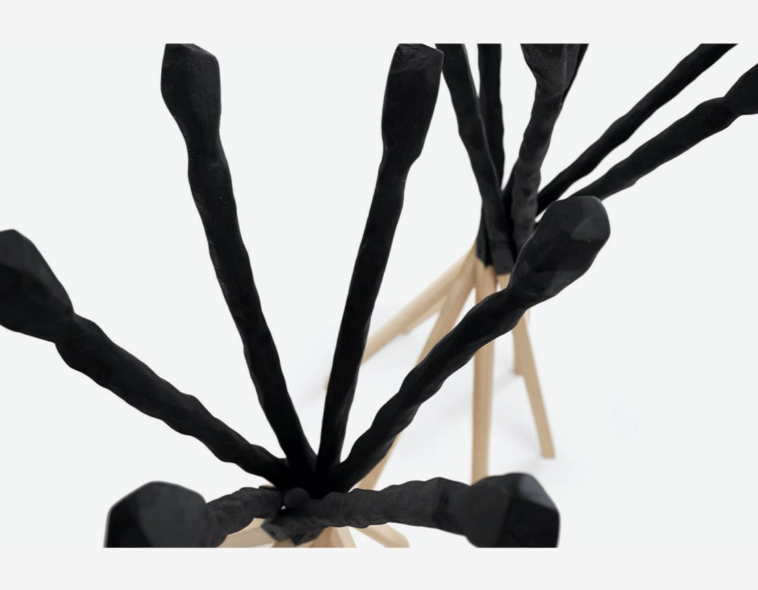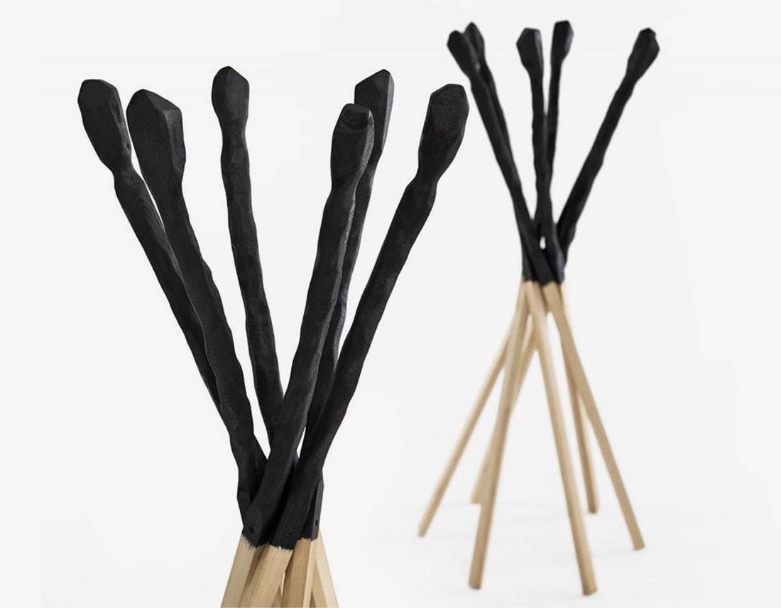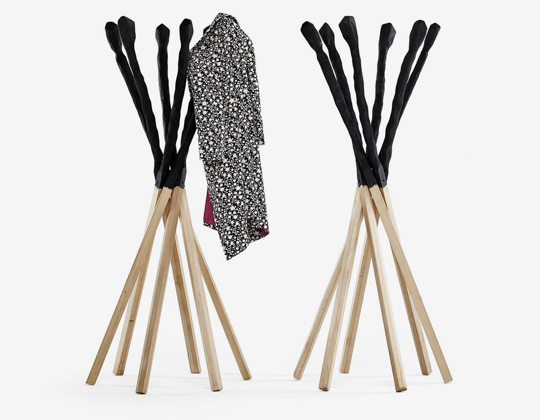 Match est un porte-manteau en hêtre massif au fini teinté noir et à l’huile naturelle. Match veut se souvenir de l’allumette consommée par la flamme. Six bâtons en bois réunis pour composer un portemanteau pratique et ironique.