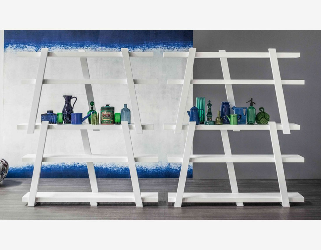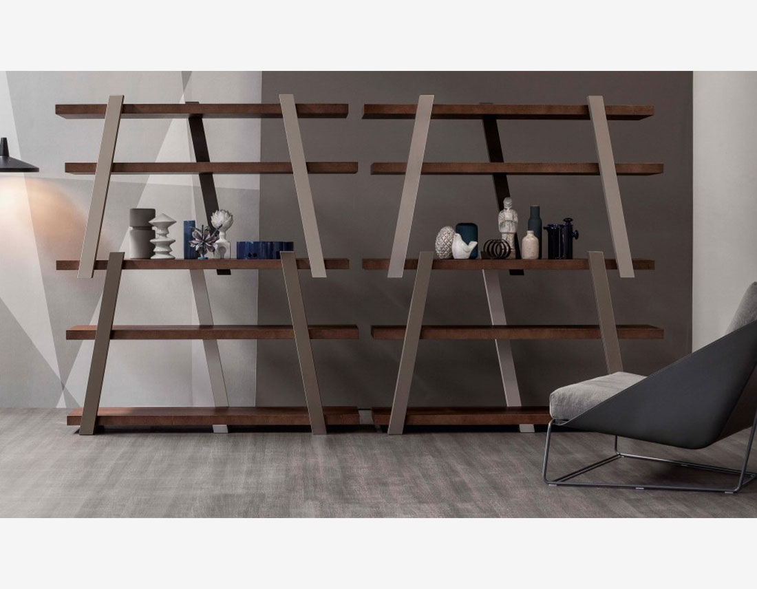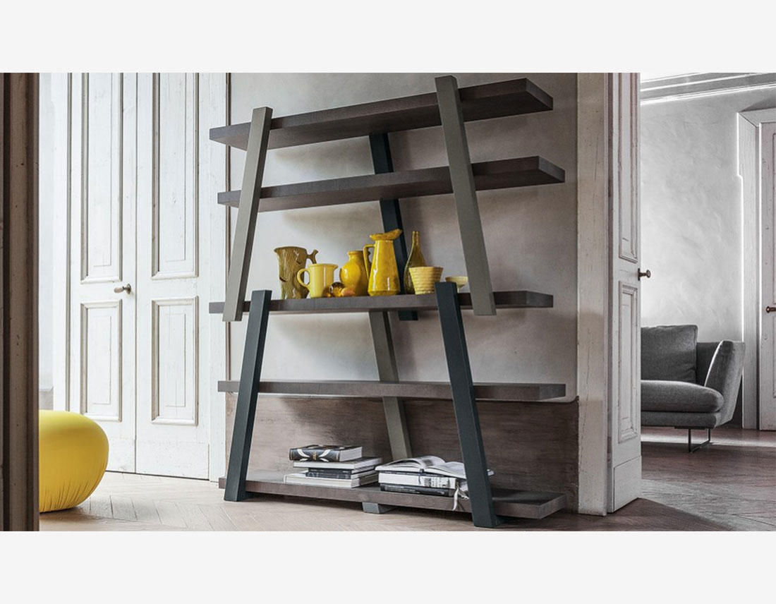 La bibliothèque Note se distingue visuellement par la combinaison de l’élément horizontal, les étagères, avec l’élément vertical, les poutres. Les étagères et les poutres sont en bois et sont disposées dans des combinaisons de couleurs spécifiques.