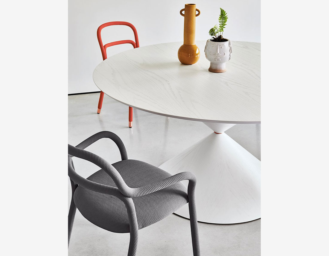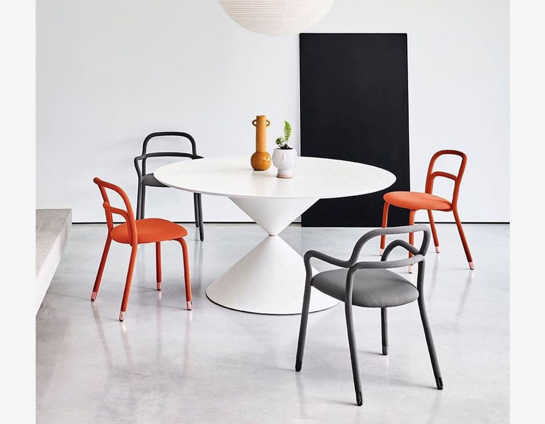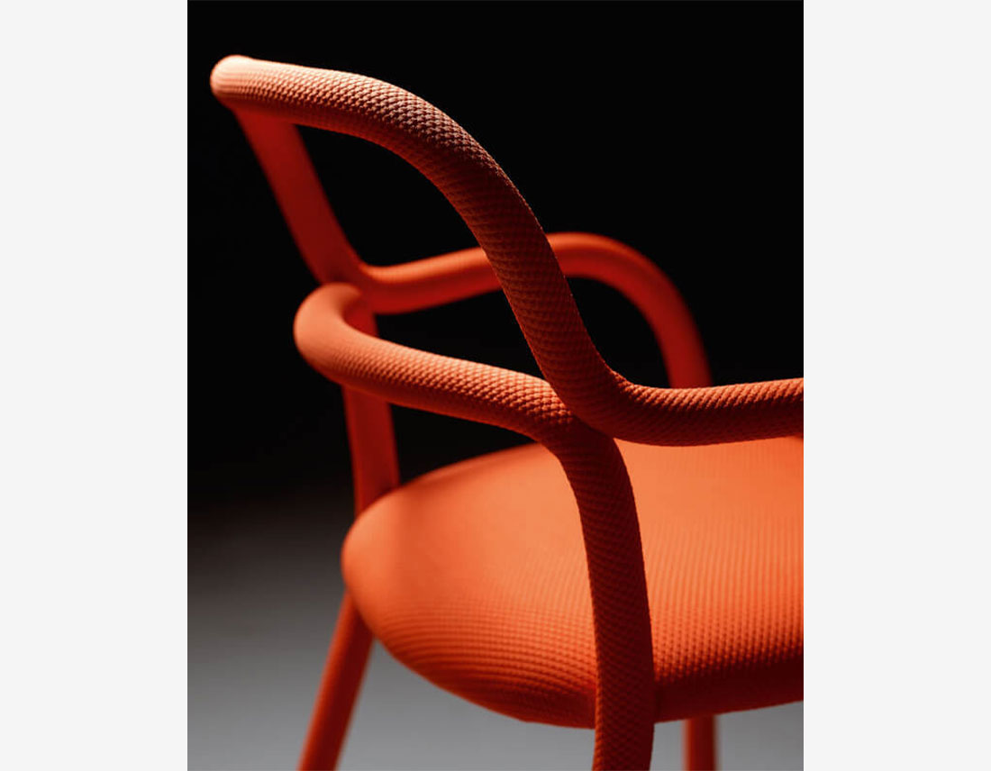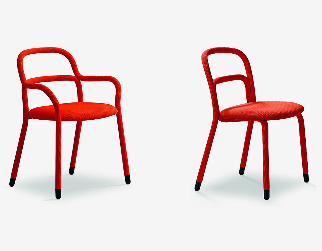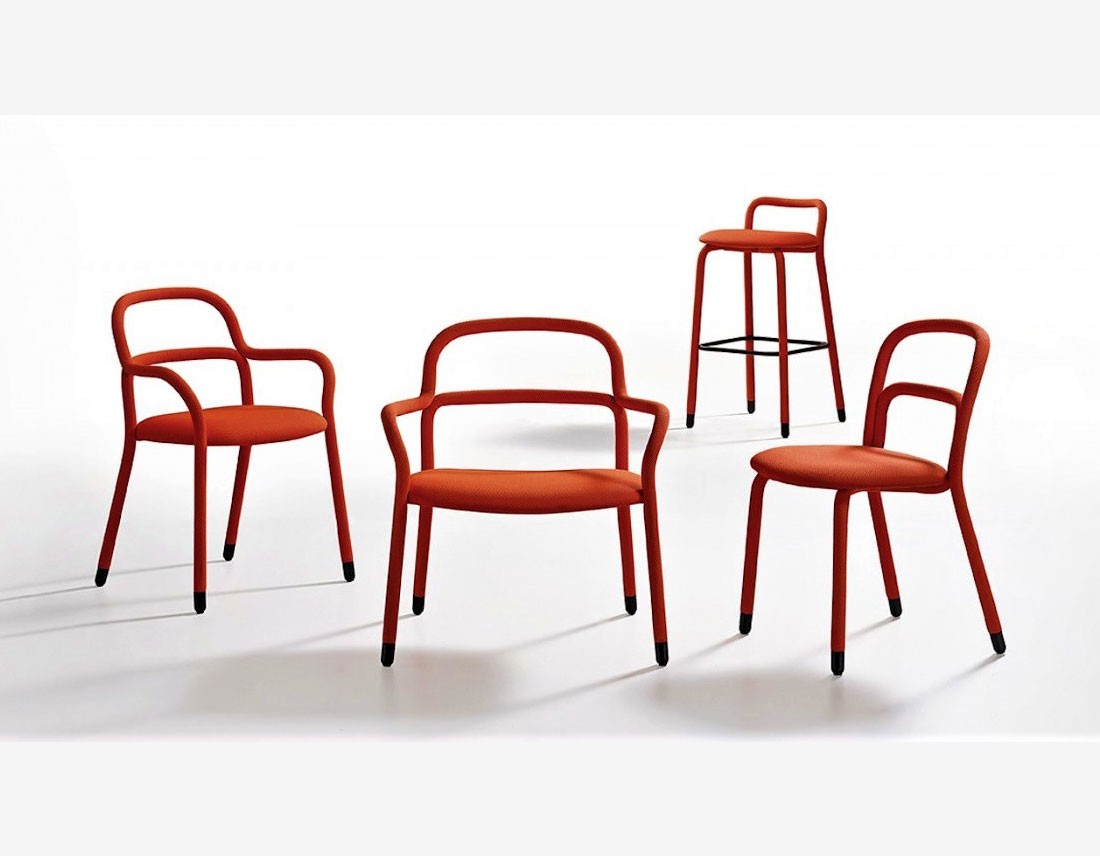 Conçue par le designer Roberto Paoli, la nouvelle collection Pippi comprend la chaise, le fauteuil, le lounge avec accoudoirs et deux tabourets de différentes hauteurs. Deux tubes métalliques incurvés constituent la structure originale de la collection Pippi. Ils sont entièrement recouverts d’un seul revêtement de tissu légèrement matelassé et biélastique qui habille la chaise de manière sartorique.