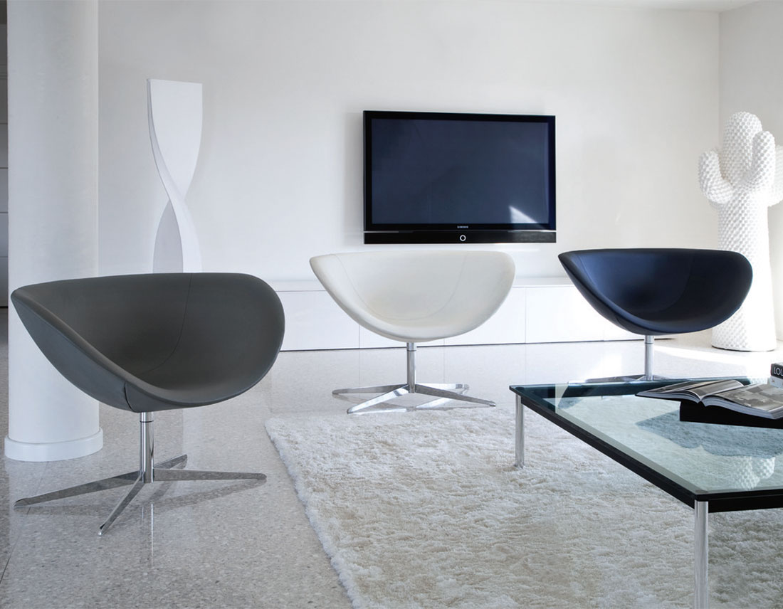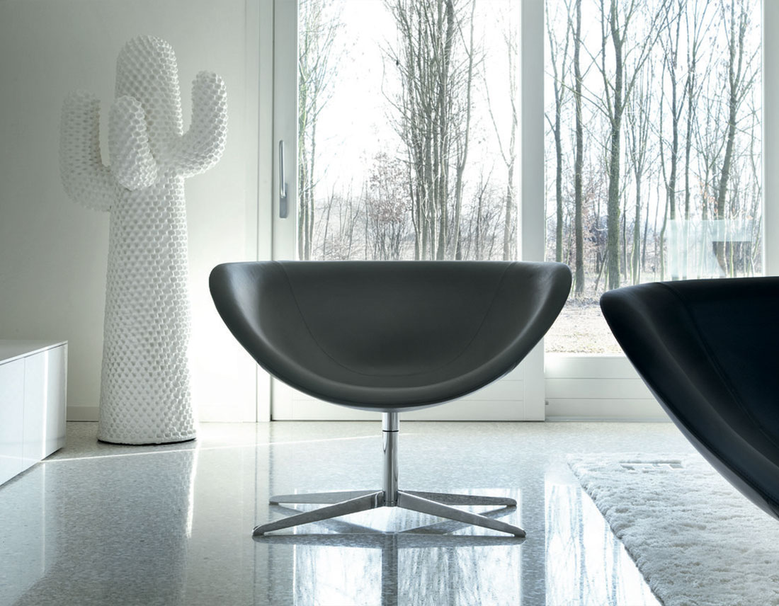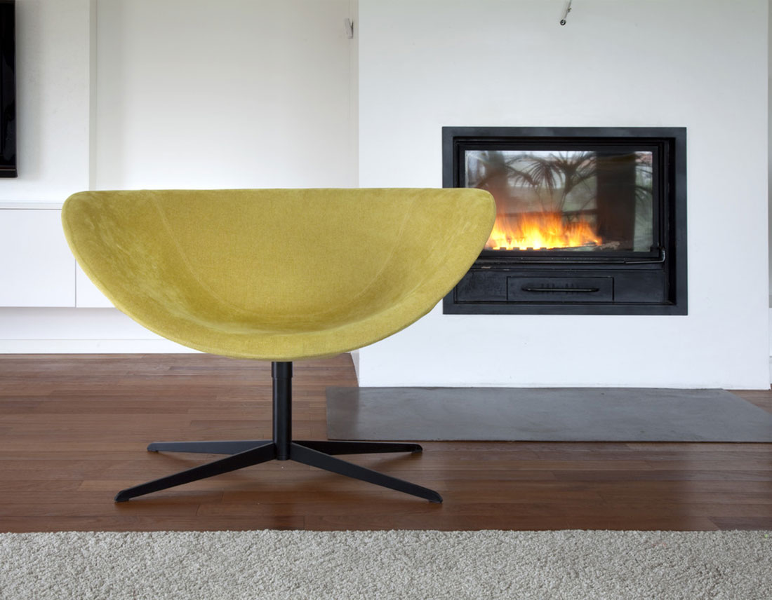 Injected fire retardant foam shell with self supporting structure in high resistance steel. Base with central column and 4 spoke cross base in polished chrome steel. 360° swivel with memory return.