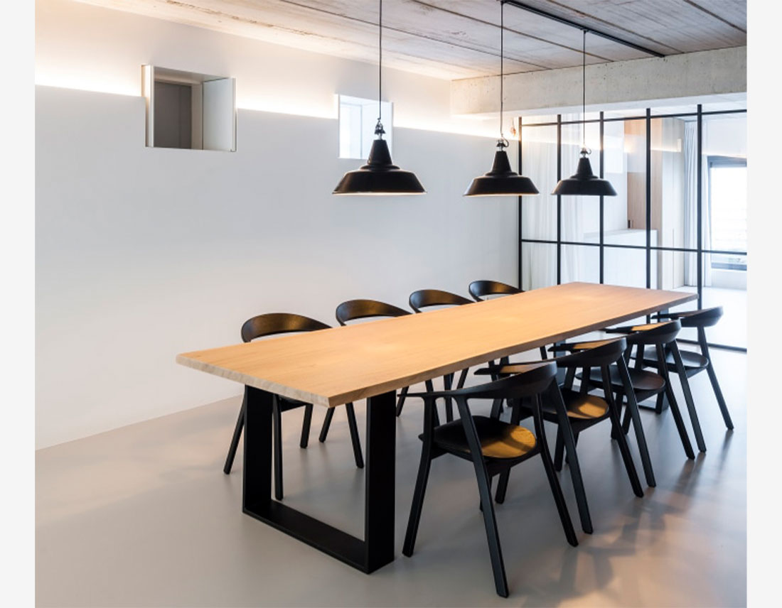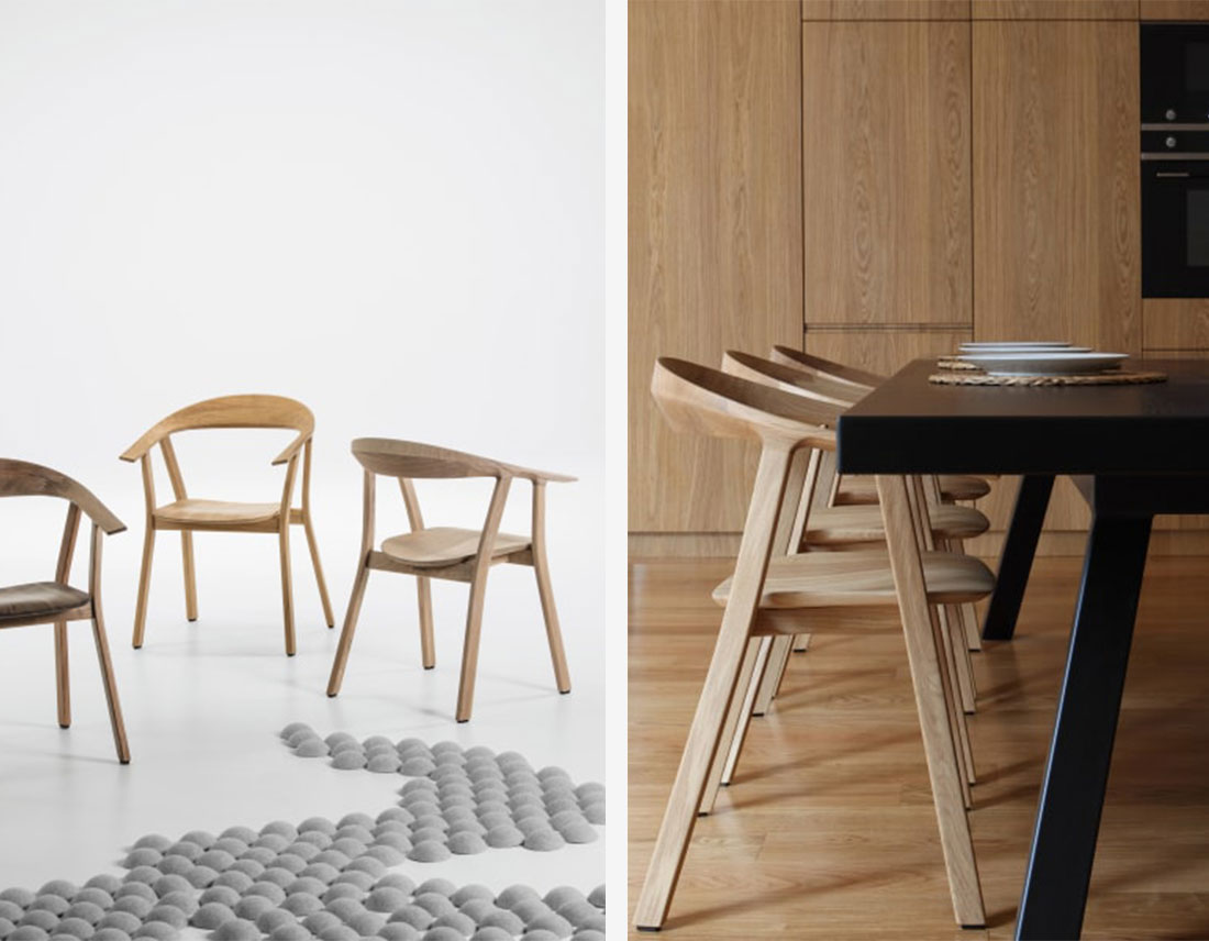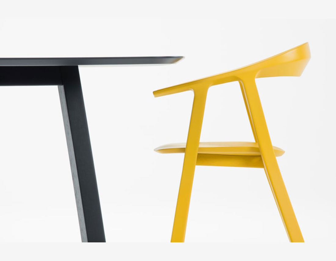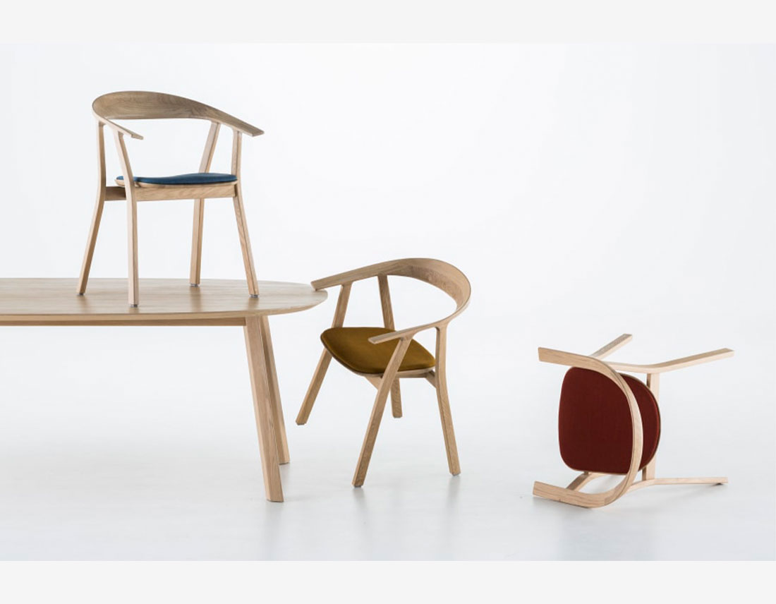 Notre intention était de créer une chaise avec une identité forte tout en ayant un confort accru. Pour cette raison, notre design comprend de minimes mais incontournables changements de géométrie et d’ergonomie rendus possible grâce à des recherches poussées tout au long du développement du projet. La chaise Rhomb est un peu plus large qu’une chaise classique avec un dossier qui se prolonge en accoudoir de façon organique. Ceci permet des positions variables et plus détendues et fait qu’un simple diner devient un acte hédoniste. La forme organique de la chaise est en opposition avec la géométrie rhomboïde contemporaine retrouvée au niveau du croisement du dossier et du piétement. Les qualités tactiles et visuelles du bois massif sont sublimées par la combinaison d’une technologie de pointe et d’une transformation manuelle sophistiquée.