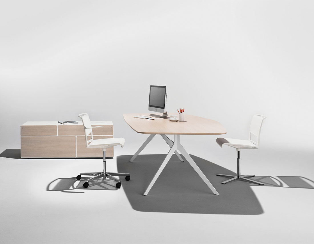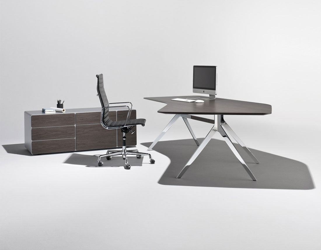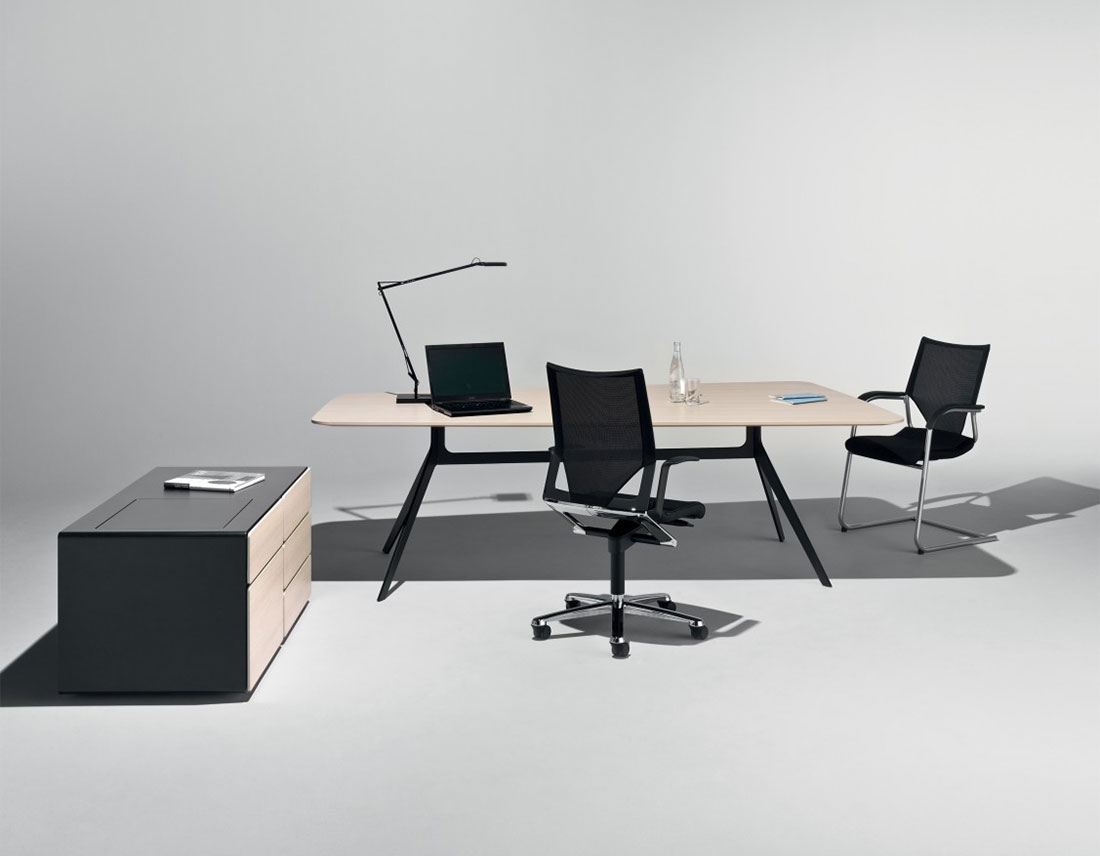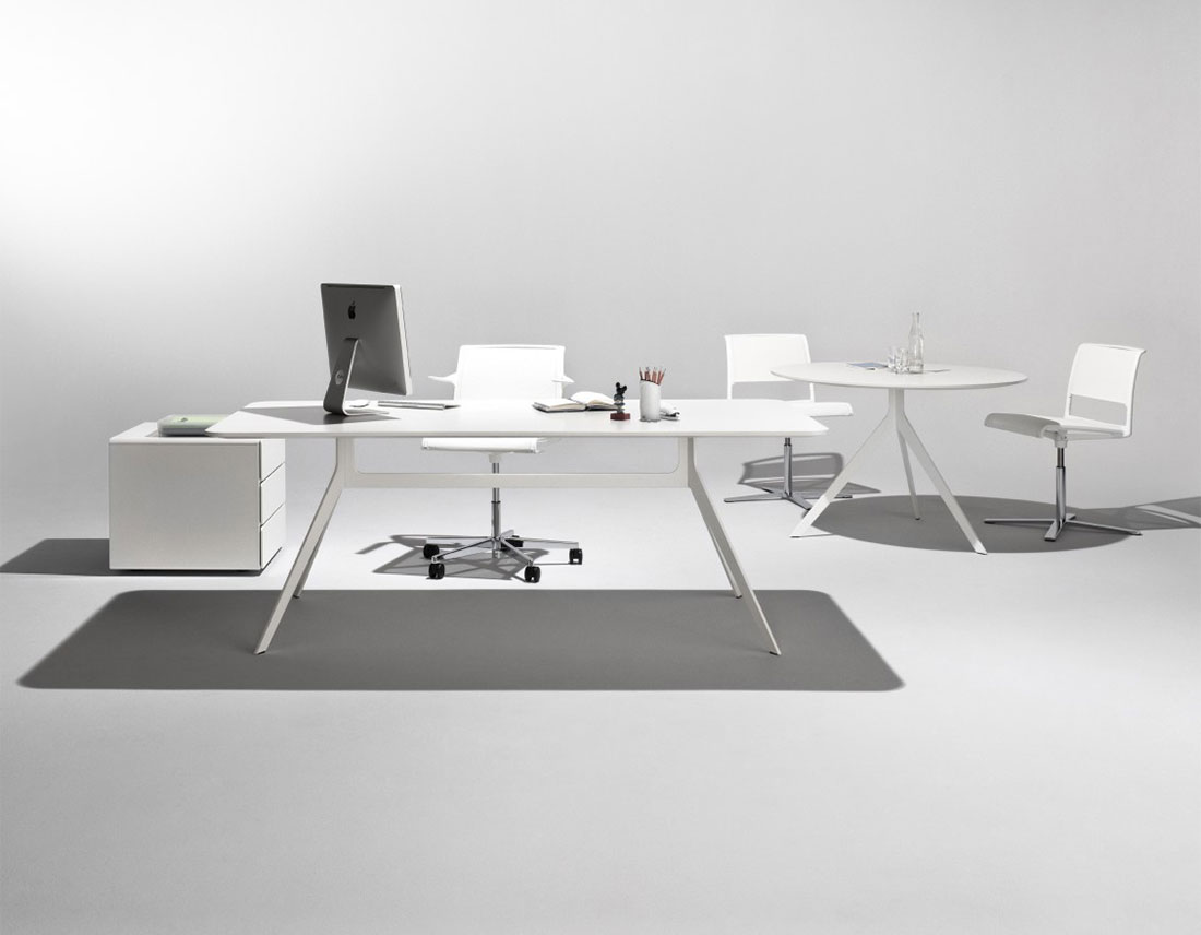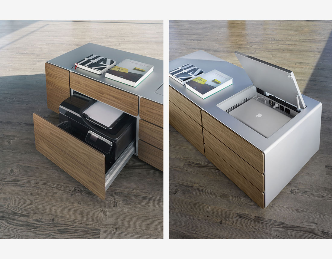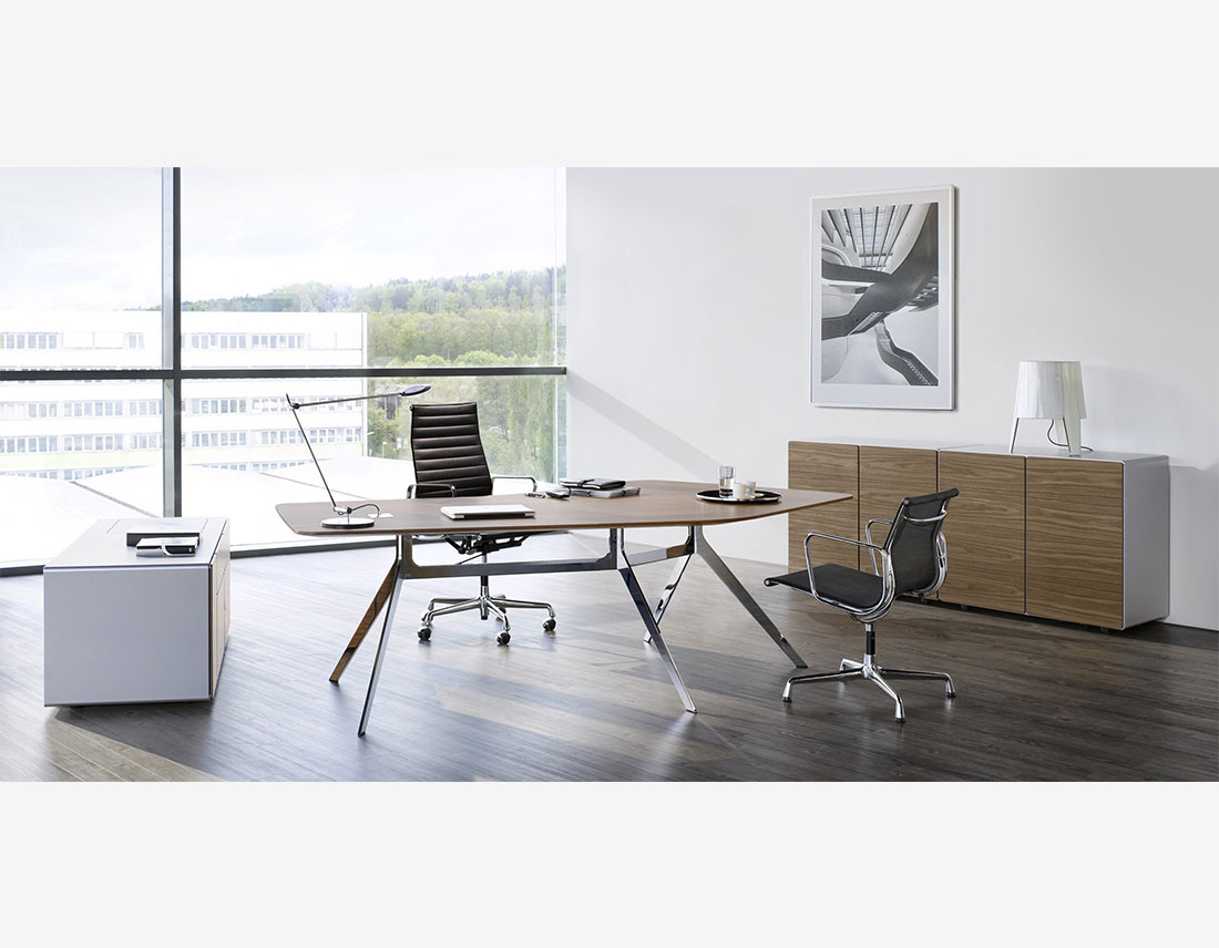 Pour faire une impression et pour la concentration. Pour les plans de bureau traditionnels ou pour des arrangements de chambre communicants ouverts. Le système de poste de travail modulaire est conçu pour des bureaux privés uniques, pour des lieux de travail d’équipe, pour des zones de réunion et pour le travail de projet. Star est un programme de bureau complet qui permet la réalisation de projets complexes en utilisant des concepts et des matériaux de conception cohérents. Les tables, les conteneurs et les buffets sont les éléments de base. Fonctionnel, de qualité supérieure et avec un look clair individuel. Les plateaux de différentes tailles et formes sont disponibles en placages fins sélectionnés ou en laque structurée pour des surfaces mates brillantes et finement structurées. Les conteneurs et les buffets sont disponibles en structure aluminium laqué argent, laqué noir métallisé ou laqué blanc.