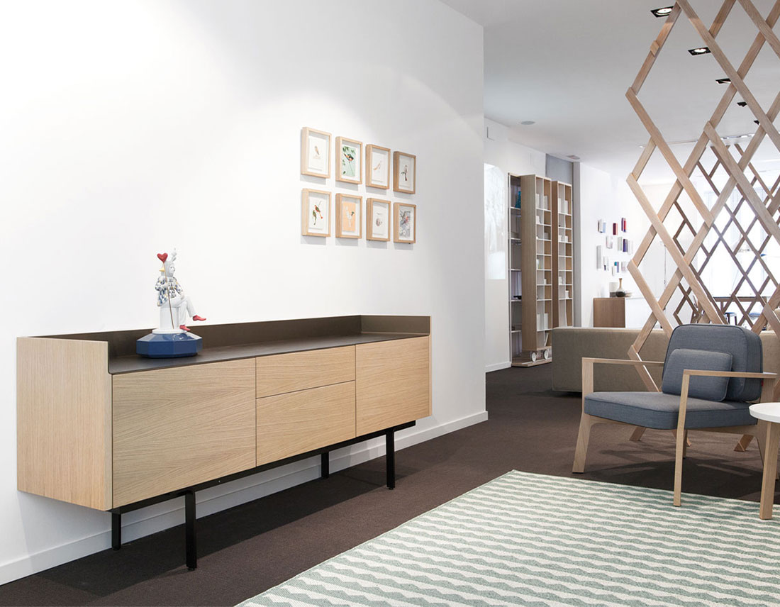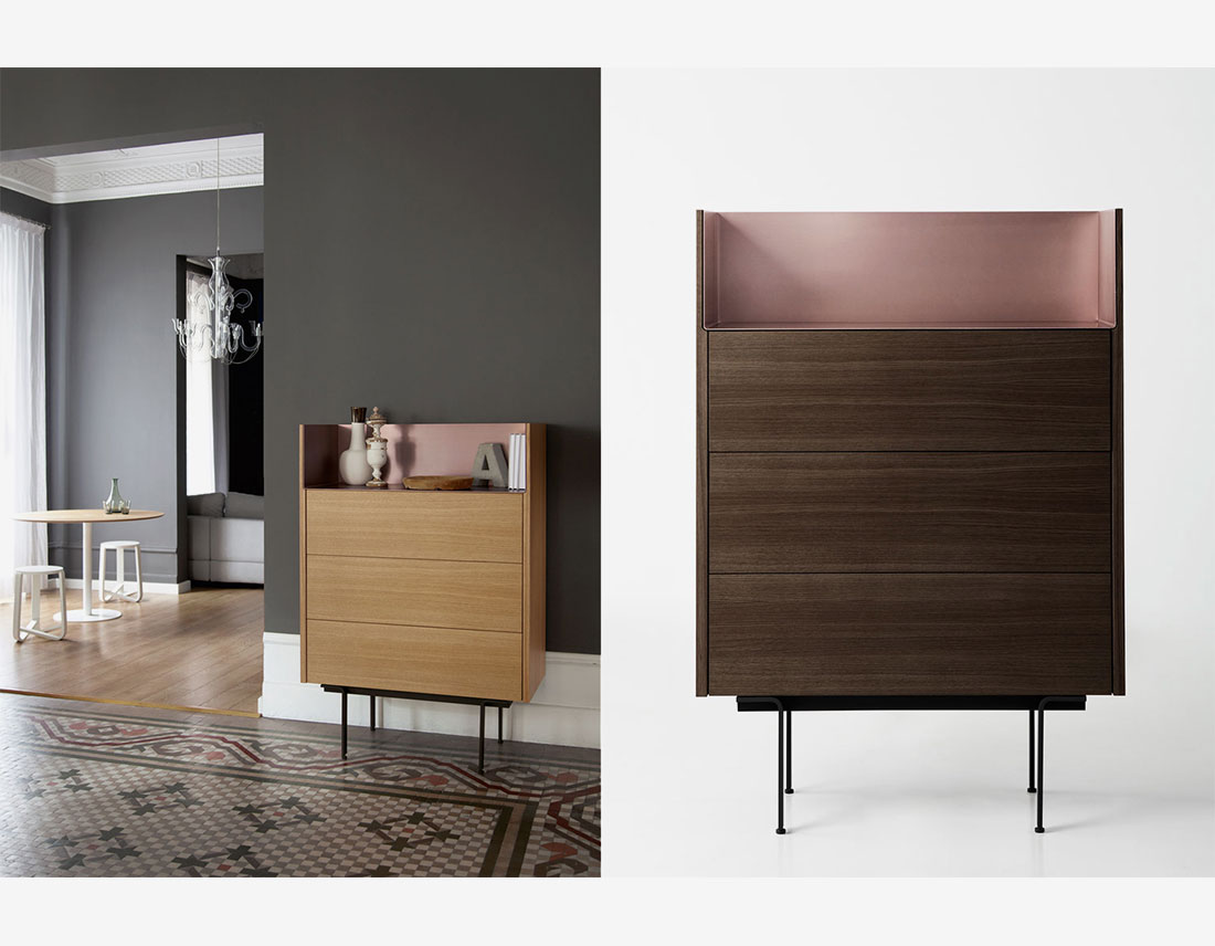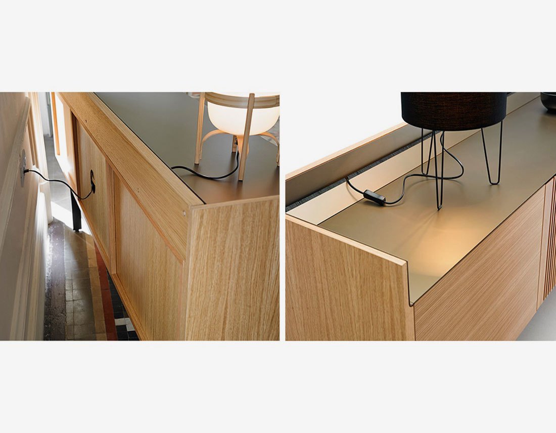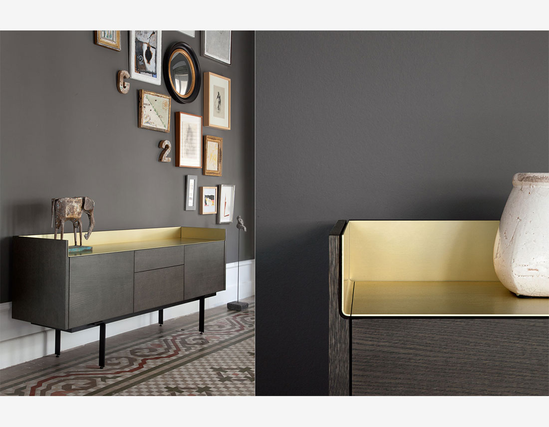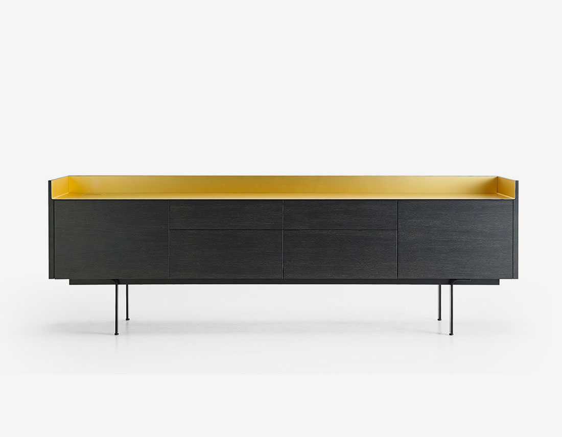 Collection de buffets, de commodes et de meubles de télévision primés au Red Dot Award 2015 avec une finition en aluminium unique sur le dessus. Meubles supportés sur socle, pieds réglables ou avec fixation murale en option.