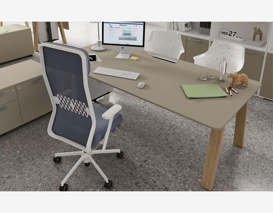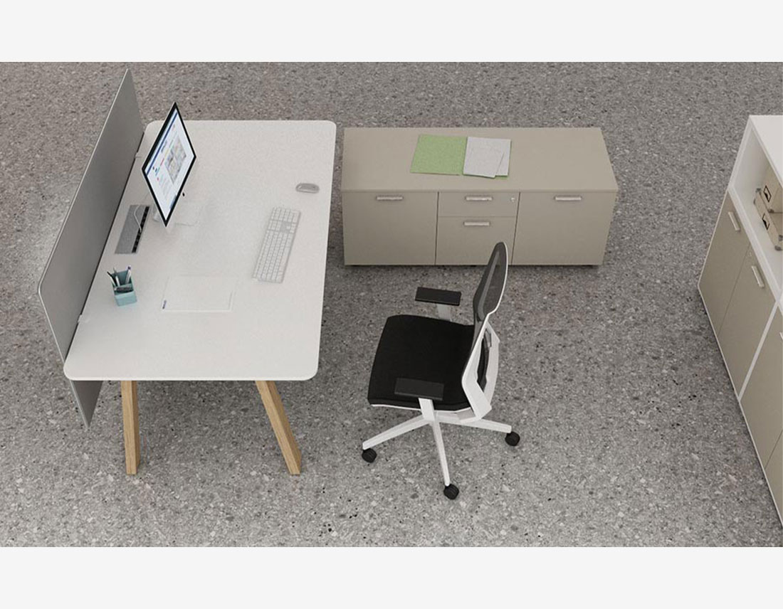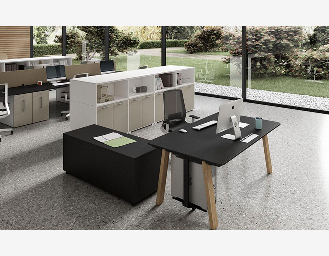 Take Off Country est un bench opérationnel de grandes dimensions, possédant des panneaux de séparation pour favoriser la confidentialité et la concentration, des plans de grand effet scénique et particulièrement agréables au toucher. La dimension des pieds donne l’idée d’une grande solidité. Les caissons à tiroirs Slim complètent la fourniture.