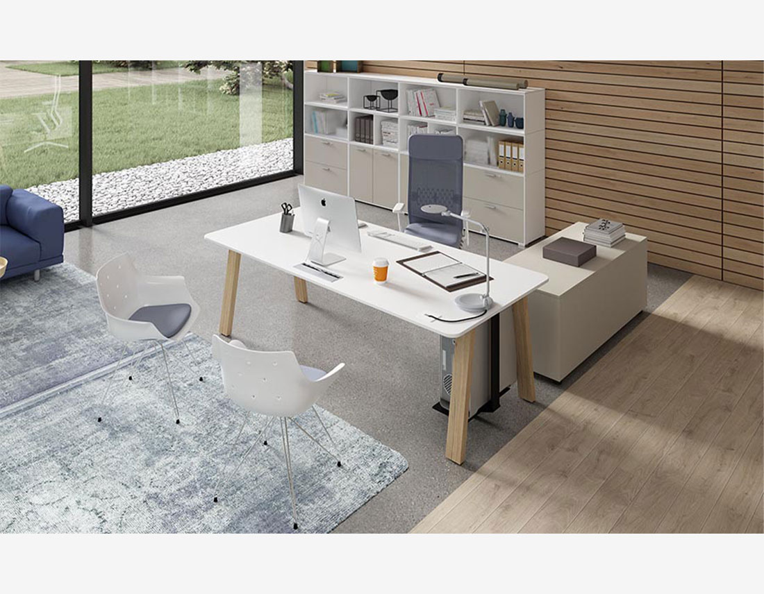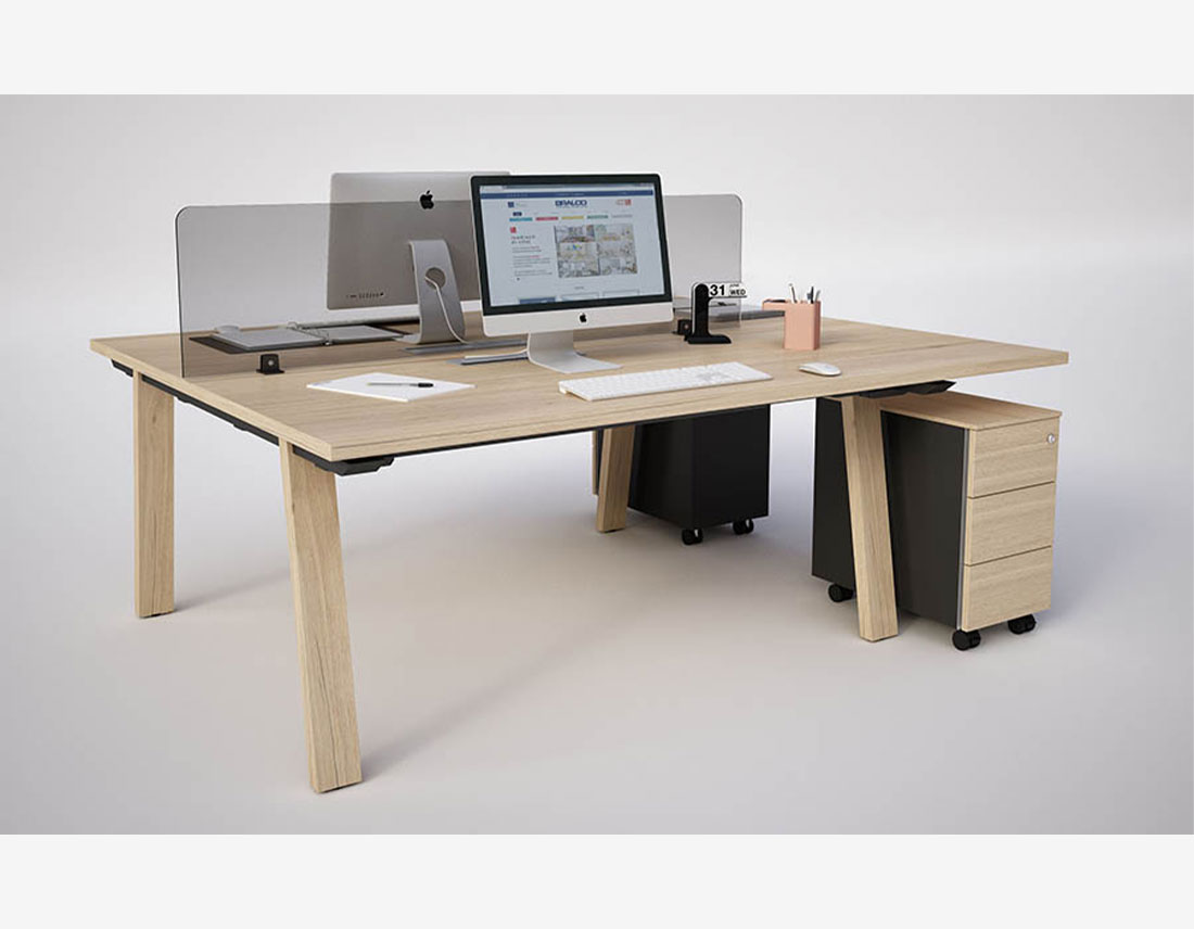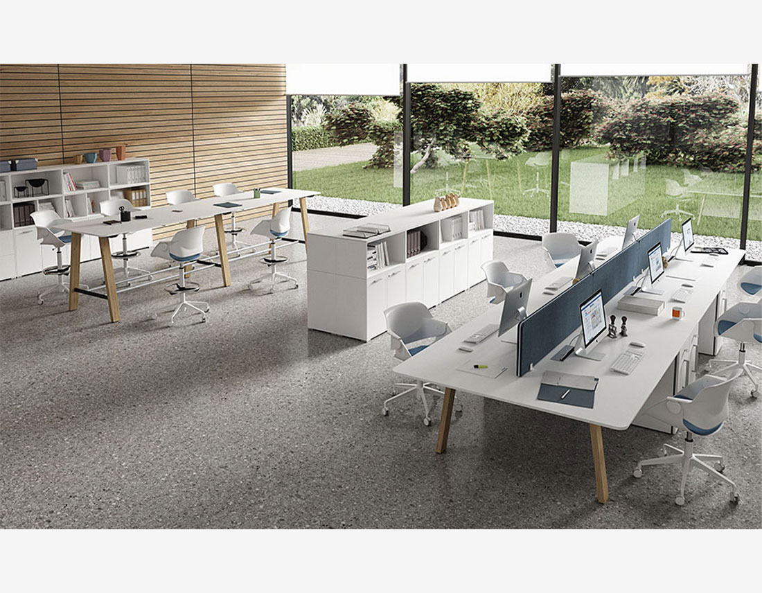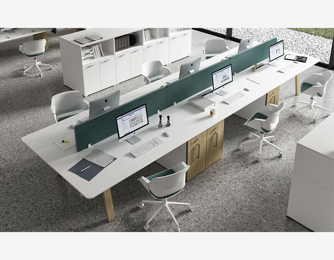 Take Off Country est un bench opérationnel de grandes dimensions, possédant des panneaux de séparation pour favoriser la confidentialité et la concentration, des plans de grand effet scénique et particulièrement agréables au toucher. La dimension des pieds donne l’idée d’une grande solidité. Les caissons à tiroirs Slim complètent la fourniture.