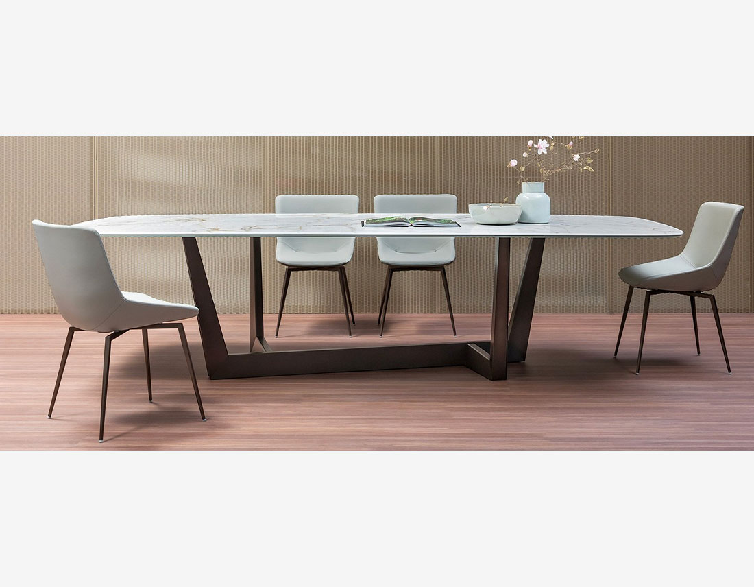 Artika est disponible avec deux différentes bases en métal verni (avec quatre pieds ou bien avec une base coulissante) dans de nombreuses finitions, afin de garantir un maximum de polyvalence dans l’utilisation, ainsi que de nombreuses possibilités de mariages chromatiques.